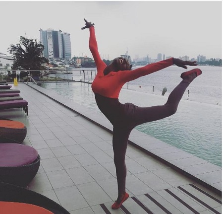 "Stretching out all that holiday fat I have gathered around my nyash. God help me" were the words of Korra Obidi as she attempted another breathtaking physical exercise of stretching flat against the wall.